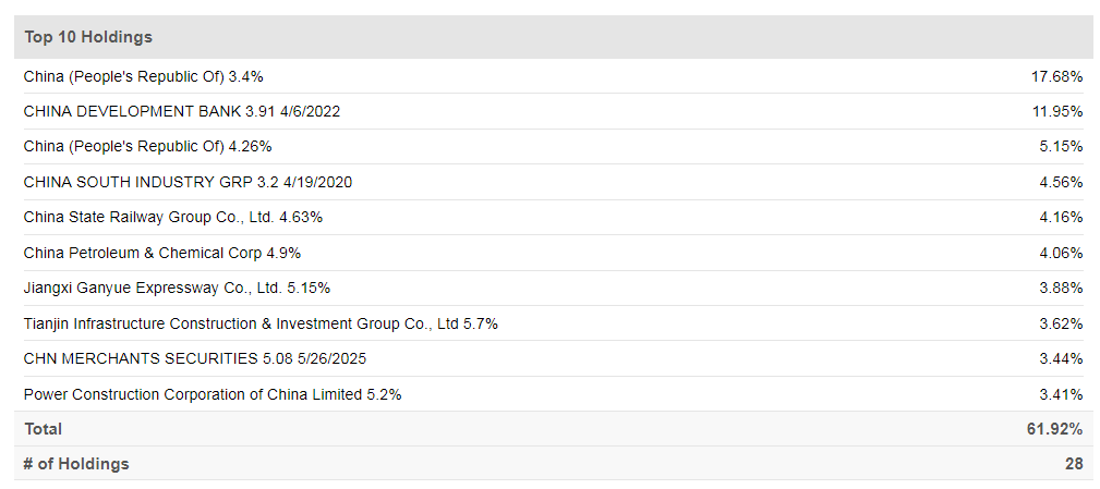 If the trends described previously are to materialize, then, we’ll need instruments that translate our vision into an investment. There aren’t many tools available for individual investors to get exposure to Chinese government bonds. However, there is one interesting ETF, VanEck Vectors ChinaAMC China Bond (CBON), that invests in the fixed income markets of China. The fund invests primarily in Renmimbi-denominated bonds issued by AAA institutions.