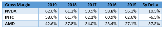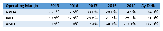 If AMD’s gross margin improvements were good, the operating margin performance was even better. The company turned from -12% operating losses to 9% operating profits in five years. Nvidia posted a great performance, while Intel, interestingly, also improved its operating margin.