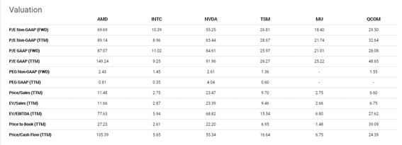 This chart tells us that Nvidia and AMD are growth stocks, while Intel is an established company growing at the same rate as the broad market.
