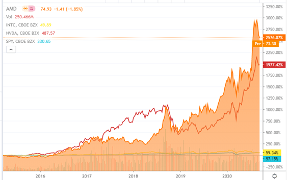 During the last couple of years, chipmakers have been star stocks. In the same period that the S&P 500 rose 57%, AMD put on an impressive 2,576% run, Nvidia rose close to 2,000%, while Intel rose 59%.