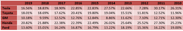 The first table is just to provide context. The second table is where the interesting information lies. The blue highlights correspond to the launch of the Model (2012), Model X (2015), and Model 3 (2017). We can see that these launches negatively impact the company’s gross margin. The Model S launch was the worst one on a relative basis. The company was coming from producing just a few thousand units of its Roadster. However, as you can observe with the naked eye, the figures have been stabilizing. Perhaps not surprisingly, the Japanese automakers in the table have the lowest variance.