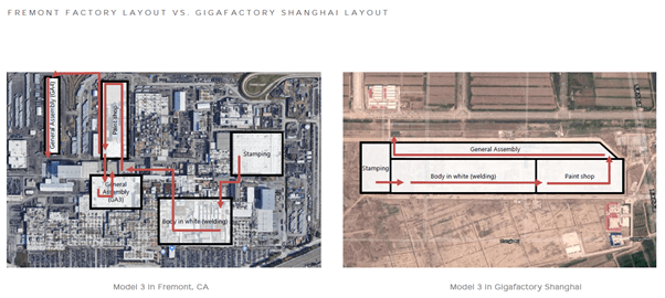 As you can see, in the picture above, Tesla has been improving its factory layout at every iteration. According to the company, the Shanghai factory investment cost was roughly 65% less per unit of production capacity than the same production system in the US.