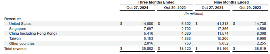15% of NVIDIA’s Q3 2024 revenue came from China and Hong Kong. Tightened U.S. export restrictions on advanced chips to China could shrink this critical market further. If restrictions extend to Blackwell chips (NVIDIA’s next-gen architecture), this could limit growth and lead to unsold inventory.