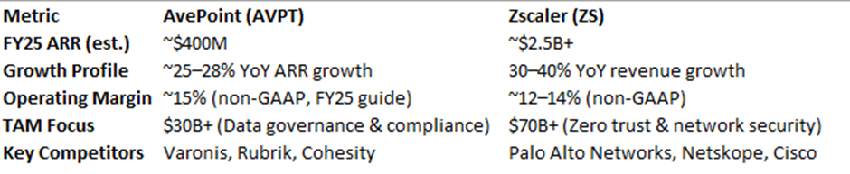 From a business standpoint, Zscaler’s in a different weight class. They’re heading toward $2.5B+ in ARR, growing fast, and competing with giants like Palo Alto Networks and Cisco. AvePoint is smaller—approaching $400M ARR—but it’s growing steadily, profitably, and carving out its own lane in governance, data lifecycle, and AI readiness. Their competitors look more like Rubrik, Varonis, and Cohesity.