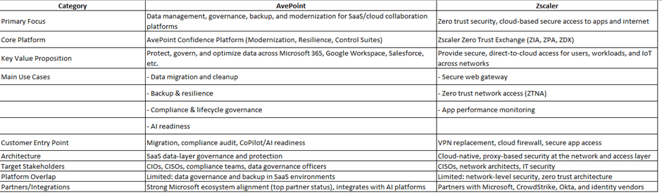 On the surface, AvePoint and Zscaler might seem like they’re playing in the same arena—security, cloud infrastructure, modern IT stacks. But once you dig in, it’s clear they’re not really overlapping. They’re solving different parts of the enterprise problem set: one’s focused on who gets in, the other on what happens once they’re in.