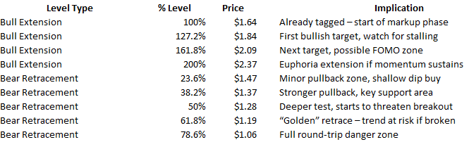 With RSI over 70, be ready for shallow retracements—something like the 23.6%–38.2% Fib levels between $1.47 and $1.37 would be healthy pauses in the trend. Upside targets to keep in mind: $1.84 (127.2% extension) as a first likely stall point, $2.09 (161.8%) for the next leg if momentum keeps building, and a more ambitious $2.37 (200%) that would probably require a new base to form first. For trailing stops, aggressive traders might set them just below $1.37 (38.2% Fib), while swing traders could tighten up to around $1.47. If $1.37 breaks on heavy volume, that’s your signal it may have been a failed breakout.