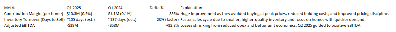 Opendoor has shifted gears in a big way. After years of chasing “growth at all costs,” it’s now running a much leaner, smarter operation. Instead of paying top dollar—or even above-market prices—for homes in hopes of riding appreciation, the company is buying properties at roughly a 10% discount and aiming to flip them faster. It’s also learning to play by more traditional real estate rules, like pricing with seasonal trends in mind, working with agents to build trust, and even staging homes to boost buyer appeal. On the marketing front, there’s been a clear pivot from expensive direct-to-consumer campaigns to agent partnerships and referrals—moves that have cut customer acquisition costs substantially. This first thesis relies on management’s ability to keep tightening operations and hitting milestones like EBITDA positivity, which they’ve guided for in Q2 2025.