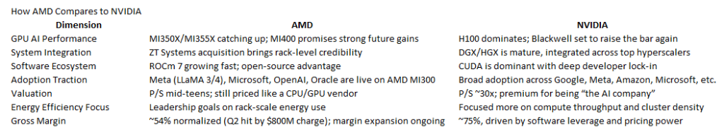 AMD, by contrast, still operates with a more modular approach. Its ROCm software stack, MI-series accelerators, and ZT Systems hardware are powerful in isolation but not yet fully integrated into a unified offering. Converging these pieces into a streamlined, end-to-end platform will be critical. That integration could determine whether it can meaningfully close the valuation gap with NVIDIA.