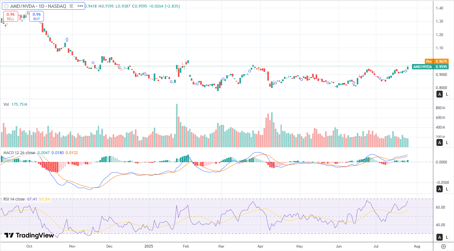 Tactically, this setup represents a momentum breakout from a prior consolidation box, supported by rising momentum indicators and a clean candle structure. Key levels to watch include $0.93 as new support (the top of the old box), $0.902 as secondary support (38.2% fib), and resistance at $0.9675 and $1.00. The absence of shakeouts or exhaustion wicks suggests that institutions are gradually increasing exposure to AMD at the expense of NVDA—a controlled rotation rather than a hype-driven move.