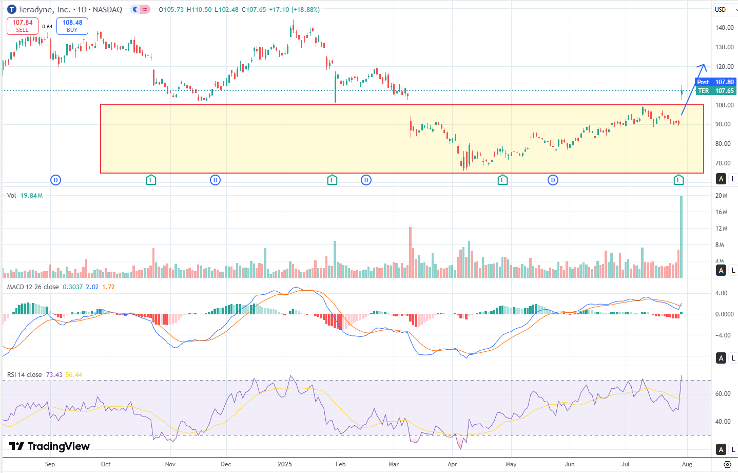 Alright, turning to the price action around the stock, Teradyne just went full beast mode today — stock ripped +18.88% and closed right near the high of the day. Absolute monster candle. No upper wick, all buying, straight up bullish marubozu type move. What makes it even more interesting is that this didn’t come out of nowhere — the chart had been coiling for weeks in a tight range around $85–$95, so today’s breakout looks like a legit momentum ignition, kicked off by earnings. You can check my full chart breakdown here, it has a play button where yo can keep tabs on the idea progress. Also, follow me on X (@pepe_maltese), I post small tidbits on the stocks I am following.