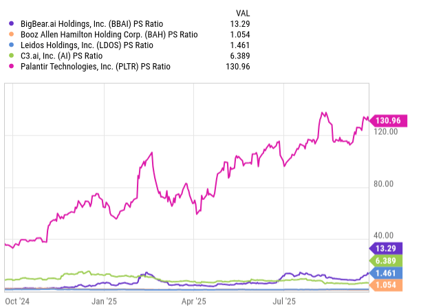 You can’t ignore the comp set. Compared with old-school federal integrators like Booz Allen (BAH) or Leidos (LDOS) that trade ~1–2× sales with mature cash flow, BBAI’s multiple has hovered well above that because it’s pitching platform-like upside in defense AI. Compared with “AI platform” peers like C3.ai (AI) or the mission-software behemoth Palantir (PLTR), BBAI is tiny, still negative on EBITDA, and far more contract-lumpy.
