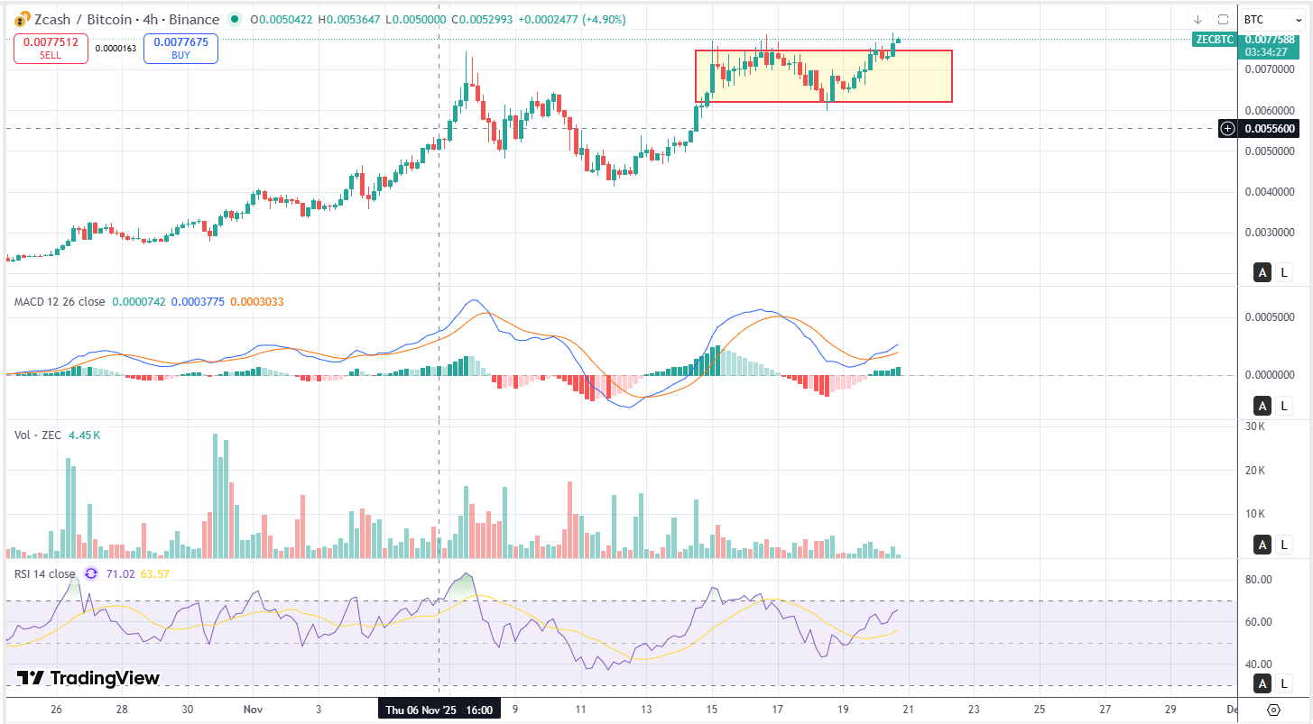 Momentum/volume: MACD turned up with a positive cross and rising histogram; RSI is back through 60–70 (bull zone). Volume contracted through the range and expanded on the up-legs, textbook for absorption before a break.