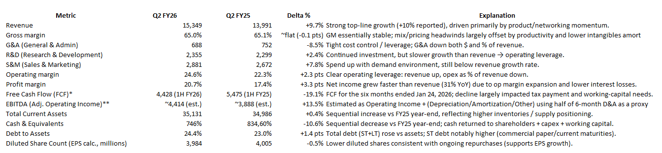 One of the most underappreciated tells in the 10-Q is balance sheet behavior. Inventories increased to $3.920B from $3.164B at FY25 year-end, and inventory purchase commitments rose to $10.062B from $7.604B. The filing attributes the increase to higher commitments tied to Cisco Silicon One and other products and the need to secure components, including memory.