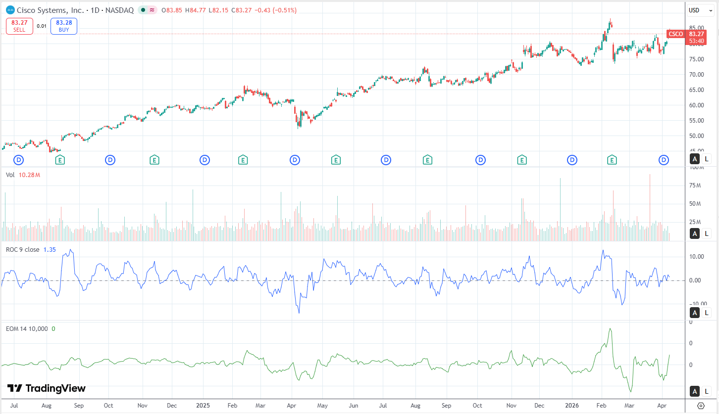 The chart, read through suggests the market is building cause after a markup. If Cisco validates durability, through conversion, margins, and cleaner platform optics, this range can resolve as re-accumulation and set up the next advance. If it doesn’t, the same range may later be recognized as distribution. Right now, the tape is saying: the first repricing happened; the second one has to be earned.