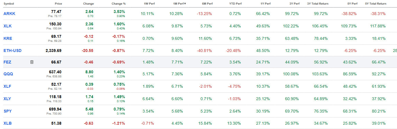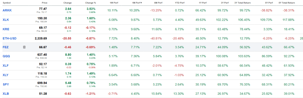 But the more important information is what’s happening now. Over the last month and week, crude is down, and XLE has softened on a 1M basis even though it remains strong over 6M/YTD. At the same time, risk is reappearing in places it typically doesn’t if the market believes it’s entering a durable oil-shock regime: QQQ and XLK are strong over 1M, SPY is firm, and even higher-beta expressions (ARKK) and cyclically sensitive segments (KRE) show meaningful 1M strength.